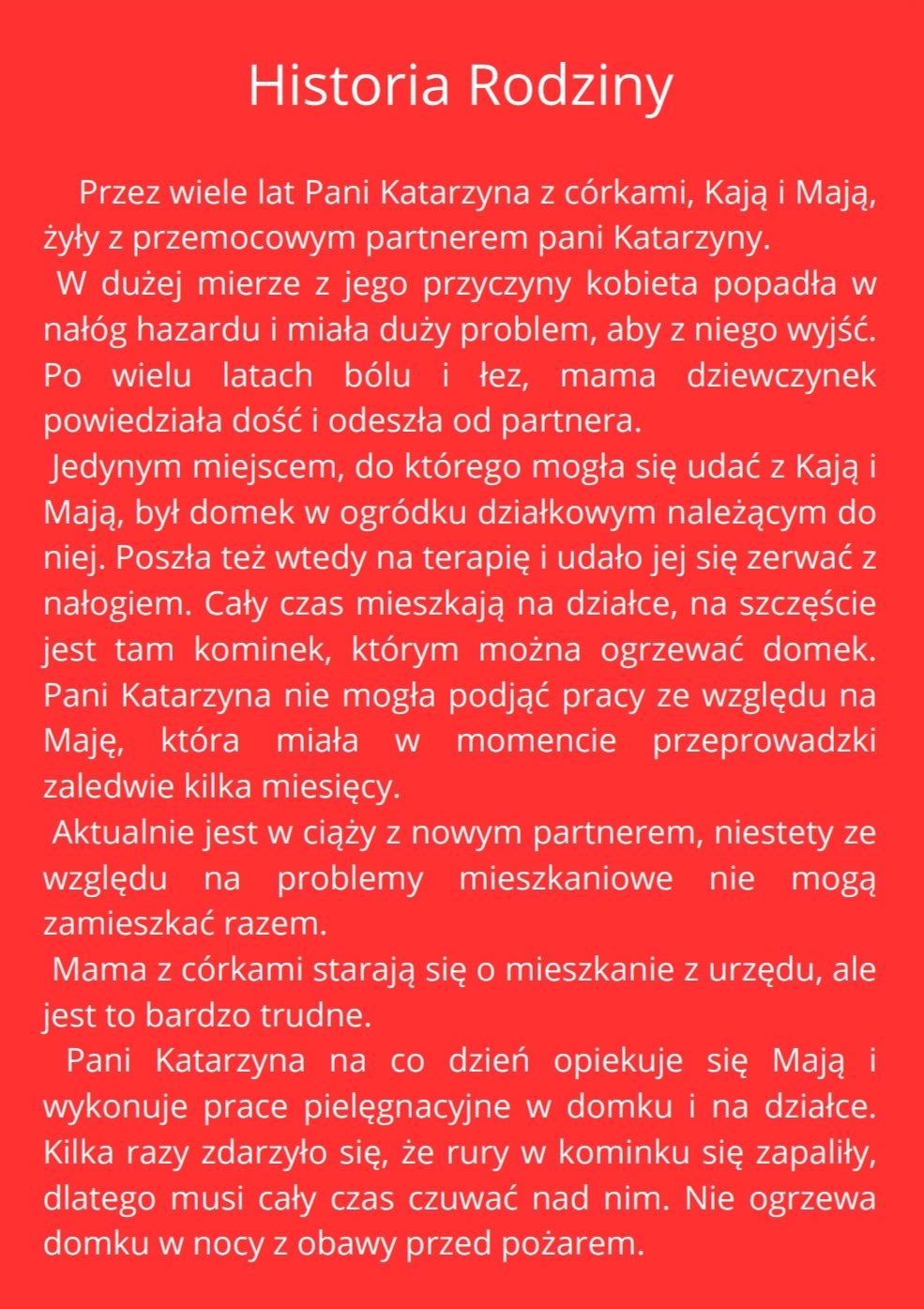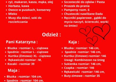 Szanowni Państwo, już kolejny raz otwieramy swoje serca aby pomóc komuś uwierzyć w lepsze 'jutro’. W tym roku wybralismy niezwykła rodzinę, której historia może rozmrozić nawet najgrubszy lód. Pani Katarzyna jest niezwykle skromna osobą, mimo możliwości jakie daje fundacja 'Szlachetna paczka’ Ona prosi darczyńców jedynie o najpotrzebniejsze rzeczy dla siebie i swoich niezwykle uroczych córek.