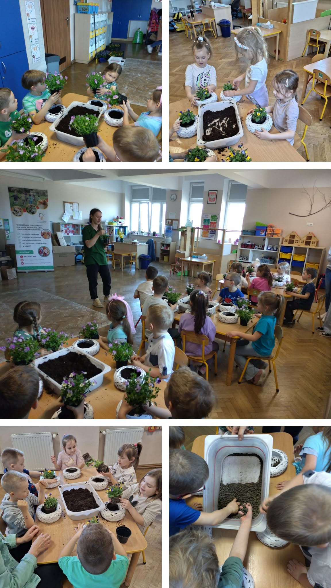 Dzieci miały okazję własnoręcznie wykonać piękne, wielkanocne dekoracje, które już wkrótce zagoszczą na stołach w ich domach. Podczas zajęć przedszkolaki tworzyły żywe stroiki, pracując z naturalnymi materiałami – keramzyt, ziemia oraz wiosennymi kwiatami. Każda praca była niepowtarzalna i odzwierciedlała pomysłowość oraz zaangażowanie małych twórców.