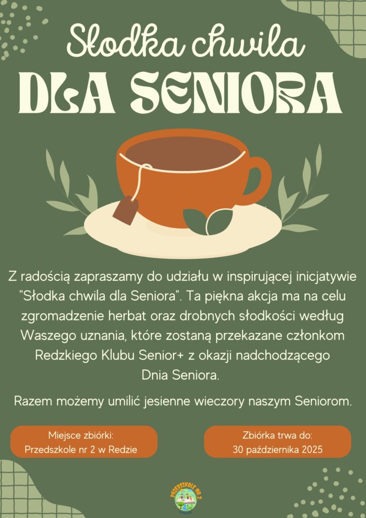 Jej misją jest zebranie różnorodnych herbat oraz drobnych słodkości wg Waszego uznania, które przekażemy członkom Redzkiego Klubu Senior+. 🎁💕
